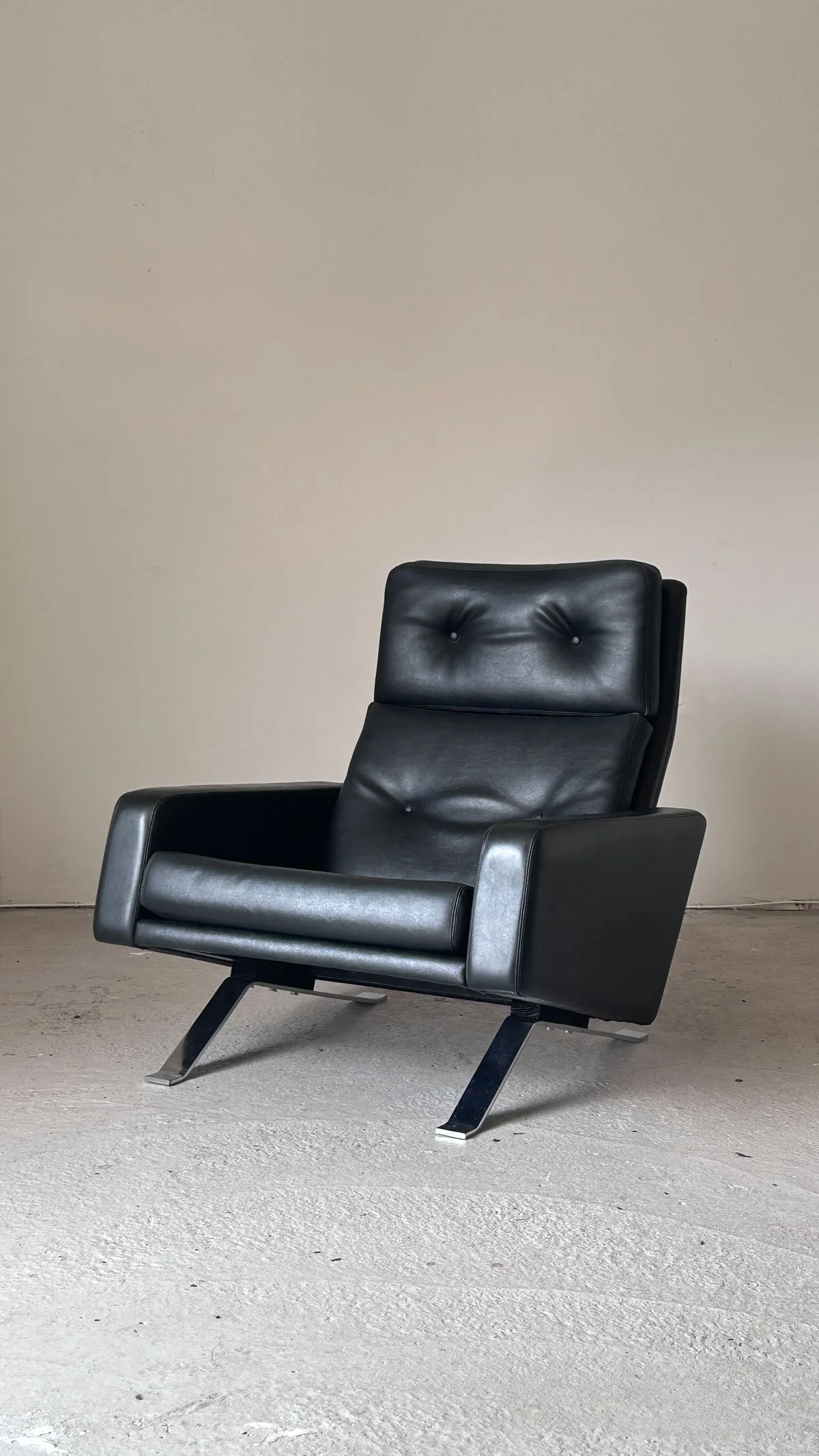 An extremely rare 1960s ‘Leo’ armchair by Robin Day for Hille, known for its bold form and sculptural chrome legs. Upholstered in original black vinyl, this striking design was famously featured in a James Bond film. A small mark on the vinyl arm (as pictured) can be professionally repaired at additional cost.